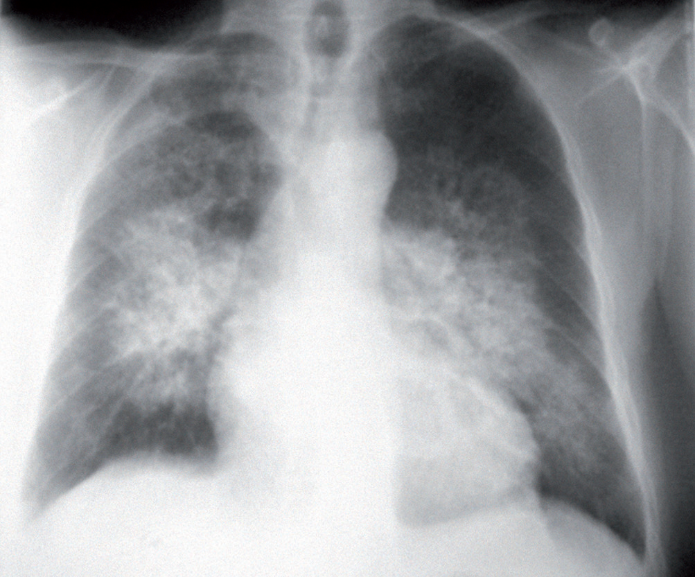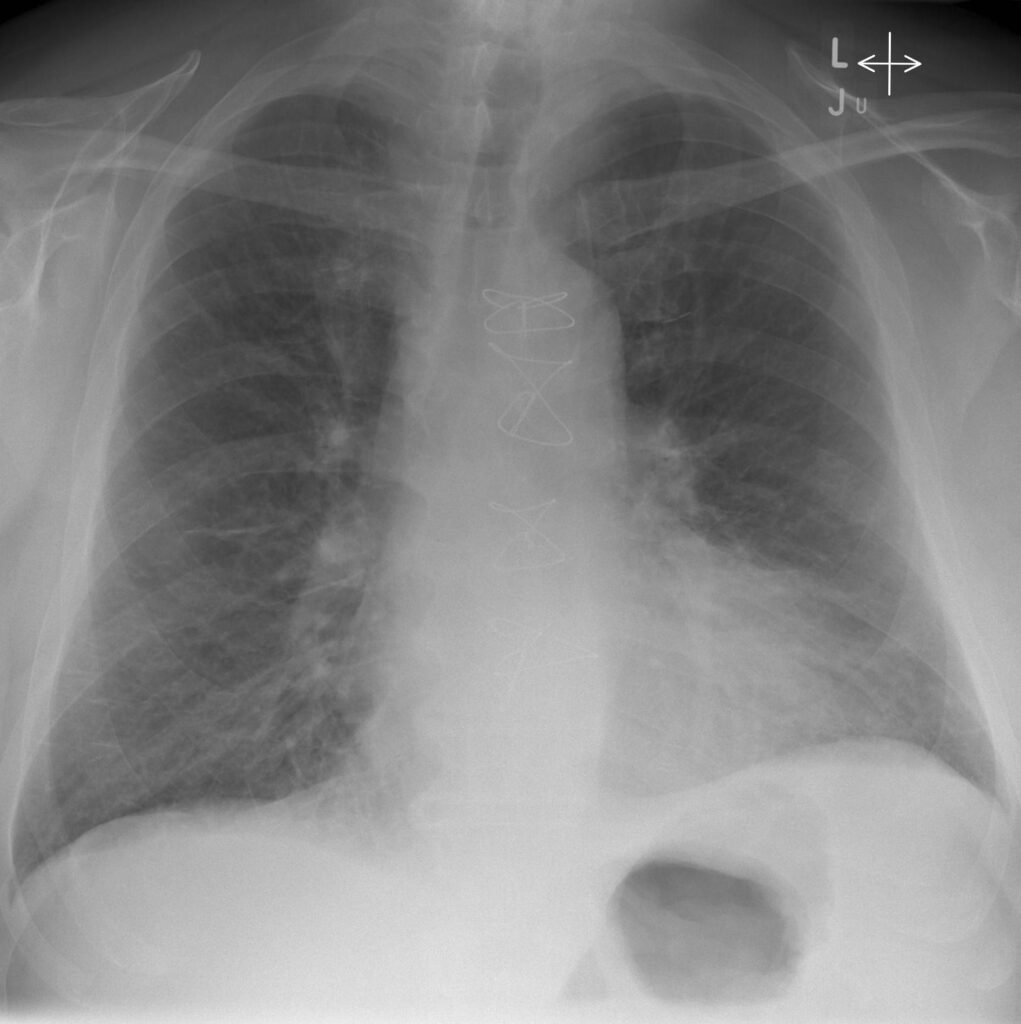 La radiografia del torace può mostrare segni di congestione interstiziale (linee di Kerley B), l’edema alveolare ad “ali di farfalla” e quote di versamento pleurico bilaterale.