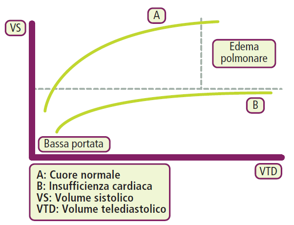 Il cuore risponde all’aumento del volume telediastolico stirando le fibre miocardiche, il che aumenta la forza di contrazione secondo il meccanismo di Frank-Starling.11 Tuttavia, nel cuore insufficiente, la curva di prestazione è piatta: l’ulteriore stiramento non produce più un aumento della gittata, ma solo un aumento della pressione venosa polmonare o sistemica.
