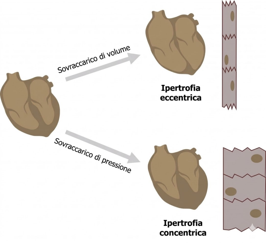 - ipertrofia concentrica: causata da sovraccarico di pressione. I sarcomeri si aggiungono in parallelo, le pareti si ispessiscono e il volume della camera diminuisce.