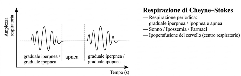 Possono comparire sintomi cerebrali come letargia o il respiro di Cheyne-Stokes, un pattern respiratorio periodico legato all’instabilità del centro del respiro e al ritardato tempo di circolo.14