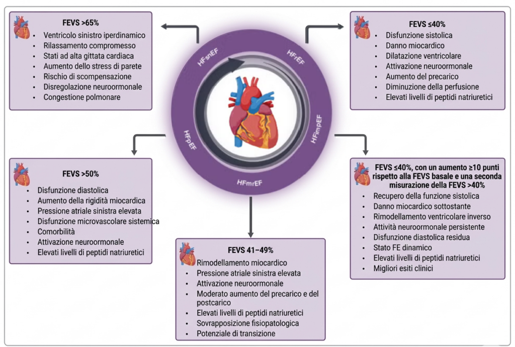 - HFpEF (HF with Preserved Ejection Fraction): LVEF ≥50%. Spesso associata a pazienti anziani, ipertesi e obesi. La fisiopatologia è legata principalmente all’irrigidimento ventricolare e all’aumento delle pressioni di riempimento diastolico;