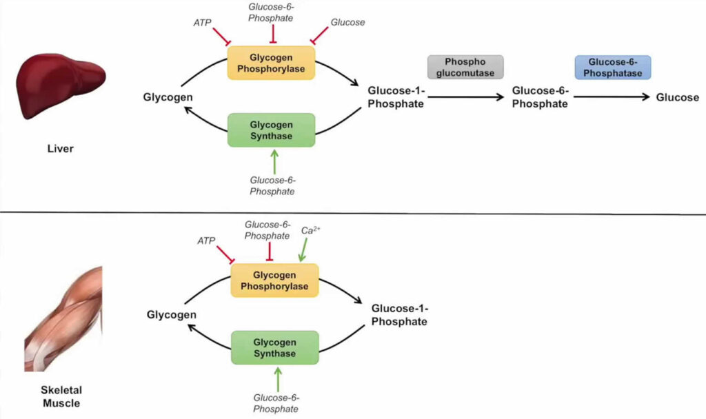 - glicogeno muscolare: costituisce una riserva energetica ad uso esclusivo del muscolo stesso, per sostenere la contrazione durante l’attività fisica. Il muscolo è privo di glucosio-6-fosfatasi e non può quindi contribuire al mantenimento della glicemia sistemica.