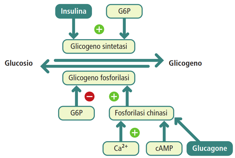 - glicogeno epatico: la sua funzione è mantenere l’omeostasi glicemica dell’intero organismo. Il fegato è l’unico organo in grado di rilasciare glucosio nel circolo ematico, grazie alla presenza dell’enzima glucosio-6-fosfatasi, che converte il glucosio-6-fosfato in glucosio libero;