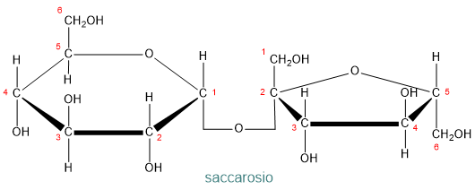 - saccarosio: il comune zucchero da cucina, composto da una molecola di glucosio e una di fruttosio, unite da un legame 1-2 α-glicosidico;