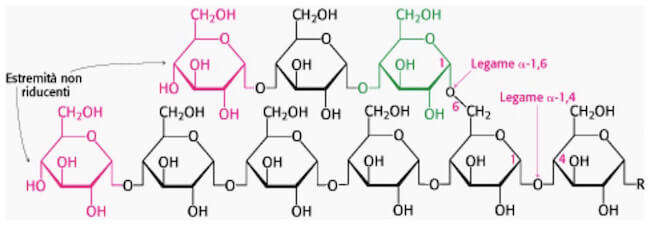 - ramificazione: l’enzima ramificante crea i legami α(1→6′), trasferendo segmenti della catena lineare per formare la caratteristica struttura ramificata del glicogeno.