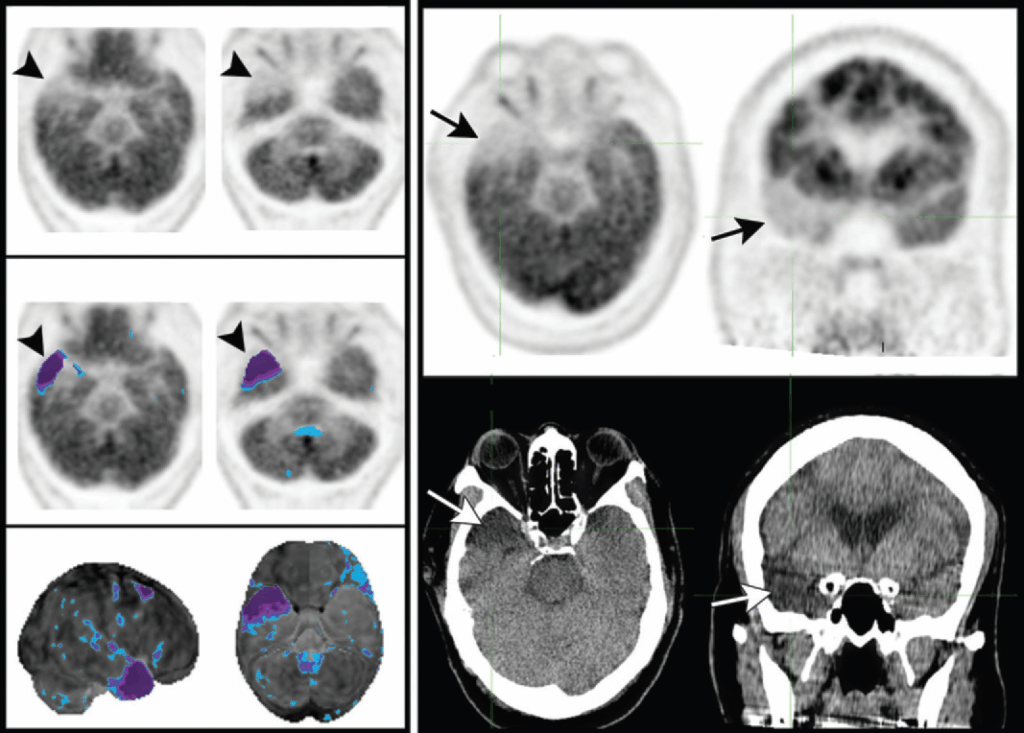 - artefatti da mappatura statistica (SPM): un artefatto comune si manifesta come una sottile area di “ipometabolismo” all’interfaccia tra la materia grigia e la sostanza bianca. La chiave per riconoscerlo è verificare che tale area si co-registri con la sostanza bianca e non si estenda fino alla superficie corticale, dove si trova la materia grigia.