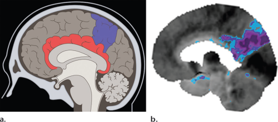 (b) L’immagine renderizzata in superficie mostra ipometabolismo da FDG nelle cortecce cingolata posteriore e del precuneo. Blu = −2 deviazioni standard, viola = −3 deviazioni standard. Il giro cingolato e il precuneo sono strutture importanti da identificare e analizzare durante la revisione delle immagini PET cerebrali con FDG ottenute in pazienti con compromissione cognitiva.