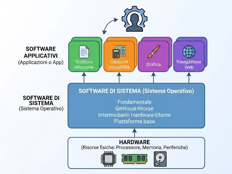 - software di sistema (sistema operativo): è il software fondamentale che gestisce le risorse del dispositivo (processore, memoria, periferiche) e funge da intermediario tra l’hardware e l’utente. Costituisce la piattaforma su cui tutto il resto opera;
